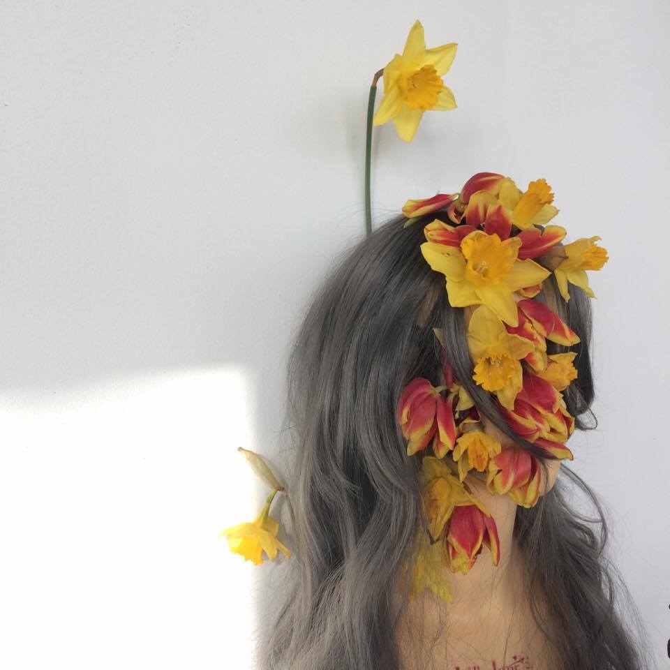 I intentionally acquired a grey wig as I feel that a coloured wig would take away from the vibrant colours of the flowers. I also believe that if the skin was white instead of a peachy flesh tone, it would accentuate the natural colour even better. As demonstrated in one of my previous paintings: